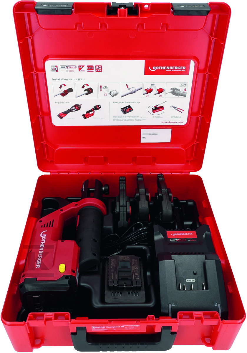 Набір ROMAX COMPACT III SV15-22-28 працює як інструмент, розроблений для тих, хто не має часу на поломки чи компроміси. Електрогідравлічний, радіальний прес з силою стискання 19 kN стискає з’єднання за 3 секунди – незалежно від положення, температури чи доступності живлення. Технологія Constant Force Technology (CFT) гарантує постійну силу протягом усього циклу, що означає однорідні, безпечні з’єднання навіть при роботі в обмежених просторах – наприклад, за стінами, під підлогами чи в вентиляційних каналах.