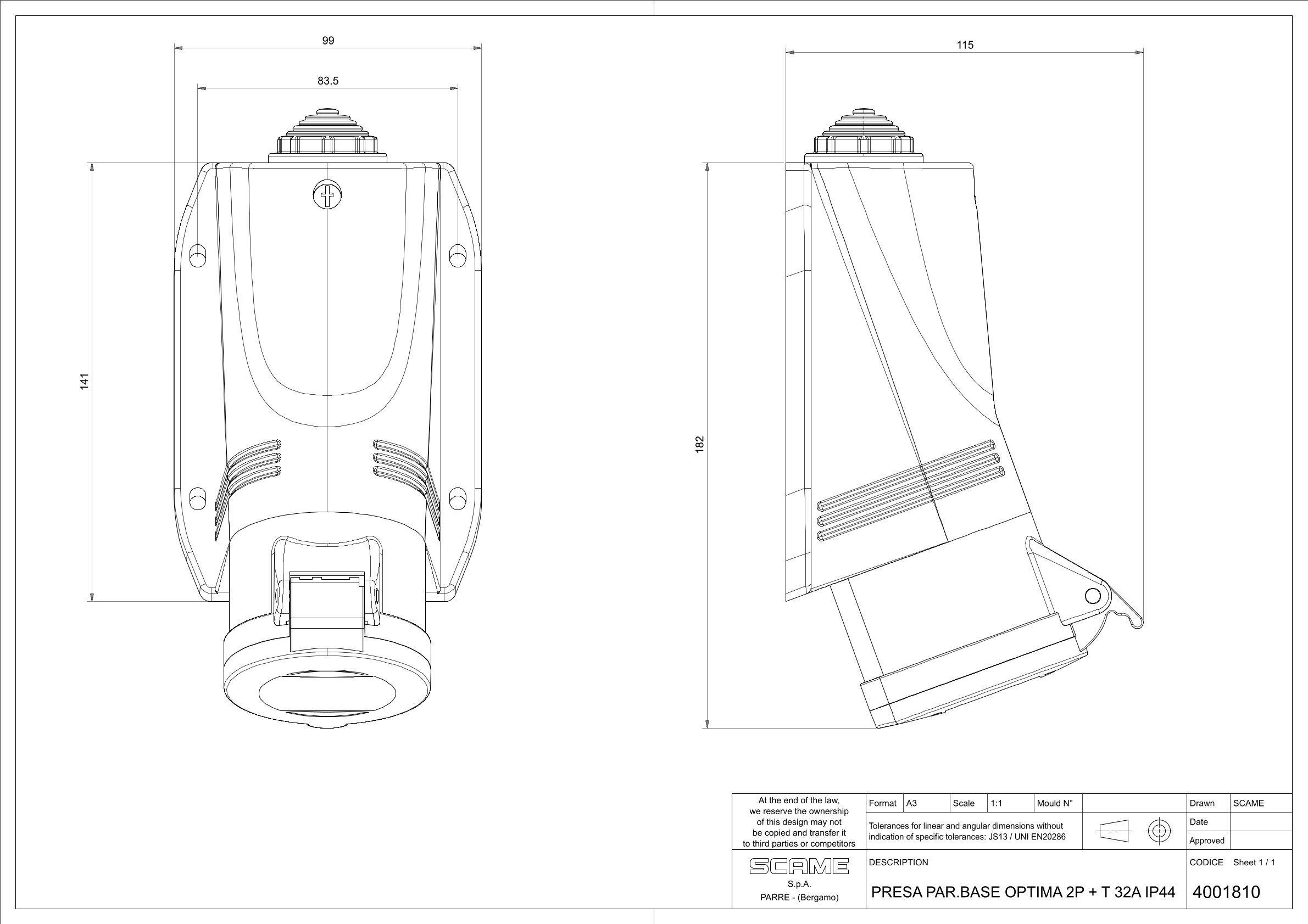 Розміри та форма відповідають стандарту EN 60309-1/2, що означає сумісність з промисловими вилками 2P+E. Розташування 6h (горизонтальне) полегшує підключення кабелів у обмежених просторах — кабель не згинається гостро, а монтаж стає більш ергономічним.