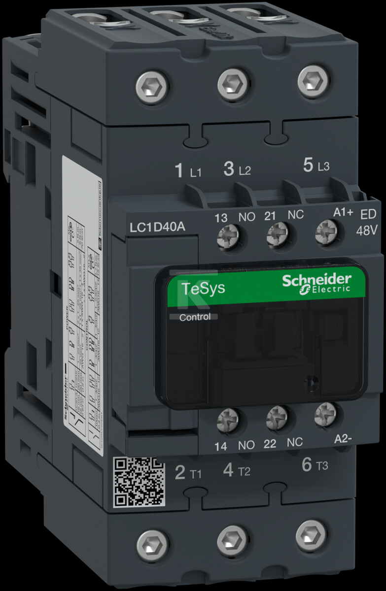 Контактор потужності TeSys D – це надійне рішення для керування двигунами, розроблене як для професійних монтажників, так і для кінцевих користувачів. Пристрій з номінальним струмом 40A, призначений для ланцюгів AC-3, дозволяє ефективно та безпечно запускати та вимикати двигуни потужністю до 18.5 кВт при напрузі 400V.Конструкція контактора базується на 3 основних полюсах, що нормально закриті, та має вбудовані допоміжні контакти – 1NO та 1NC, що збільшує його функціональність та дозволяє безпосередньо використовувати в ланцюгах безпеки відповідно до норми IEC. Котушка, що живиться напругою 48V DC з модулем захисту від перенапруги, забезпечує стабільну роботу та захист від пошкоджень. Підключення основних контактів реалізується за допомогою гвинтових з'єднань EverLink BTR, а