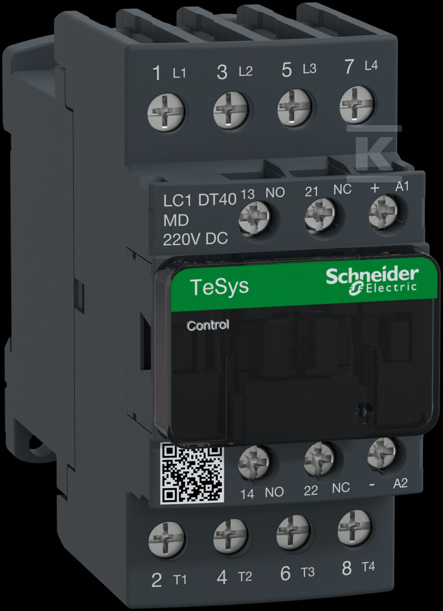 Номінальний струм AC-1 (400V) становить 40A, а напруга котушки – 220 VDC. Контактор має чотири головні замикаючі контакти, один допоміжний розмикаючий та один допоміжний замикаючий контакти, а з'єднання головних контактів реалізується за допомогою гвинтових клем.