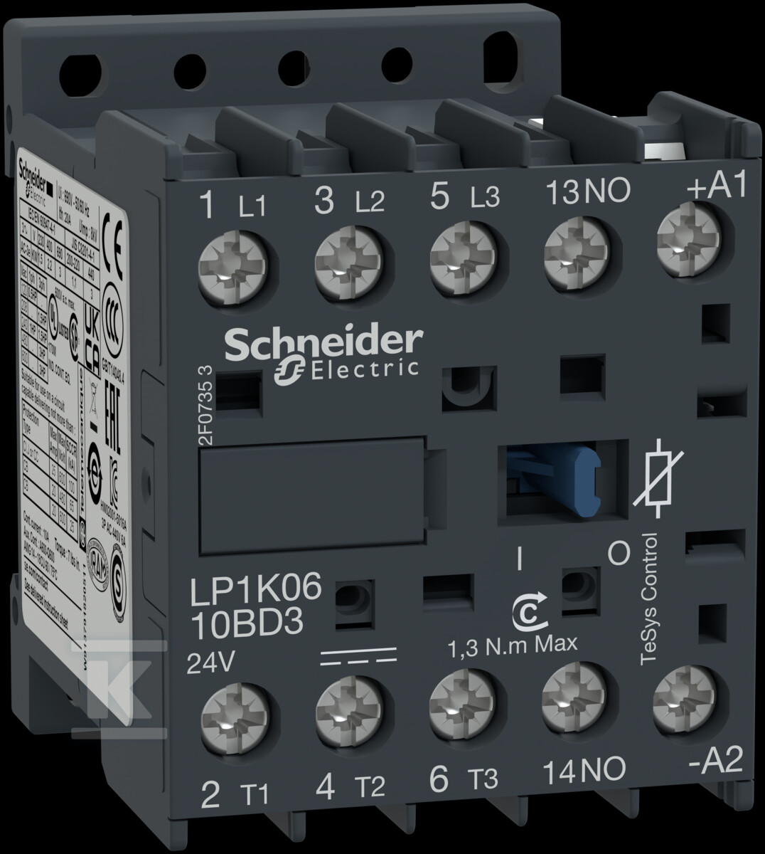 Контактор TeSys K дозволяє ефективно керувати двигунами потужністю до 5,5 кВт при напрузі 400V (AC-3), а також ненасиченими навантаженнями до 20A при 400V (AC-1). Має номінальний робочий струм Ie на рівні 12A для AC-3 при напрузі 400V та живлення постійною напругою 24V DC. Підключення головних контактів реалізується за допомогою гвинтового з'єднання.