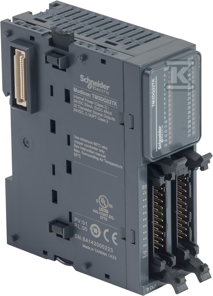Модуль TM3DQ32TK розроблено для співпраці з контролерами Modicon M221, M241, M251 та M262. Використовує транзистори PNP для перемикання навантажень, що робить його ідеальним рішенням для керування різноманітними виконавчими елементами – від клапанів і насосів, до сигналізаторів і нагрівачів. З'єднувач HE 10 полегшує швидкий і безпечний монтаж та підключення проводів. Компактні розміри (33.5 мм ширини, 90 мм висоти та 81.3 мм глибини) дозволяють встановлювати в обмежених просторах.