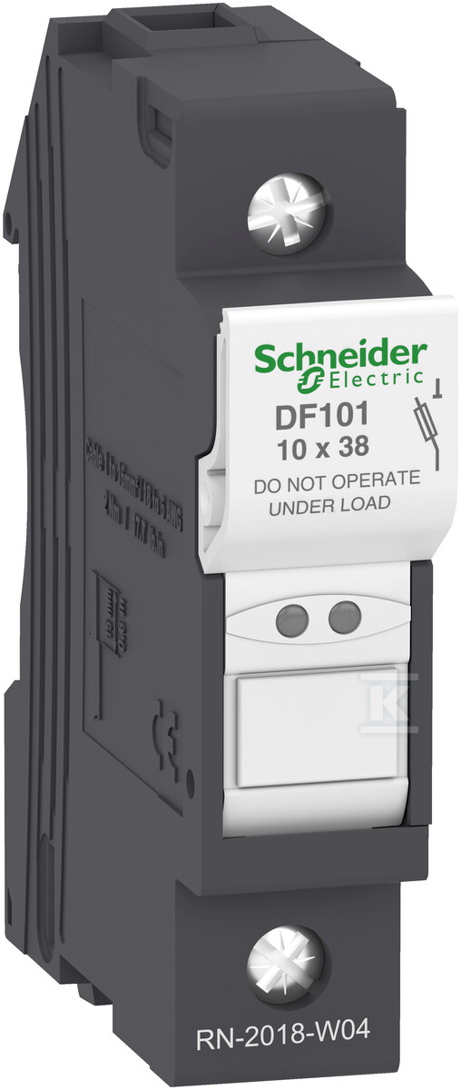 Підставка запобіжника DF101 характеризується номінальною напругою 690V, працює із запобіжниками розміром 10x38 mm і має один полюс. Монтаж здійснюється на DIN-рейку, а її ширина становить 1 модуль. Ступінь захисту IP20 забезпечує базовий захист від дотику та проникнення твердих тіл.