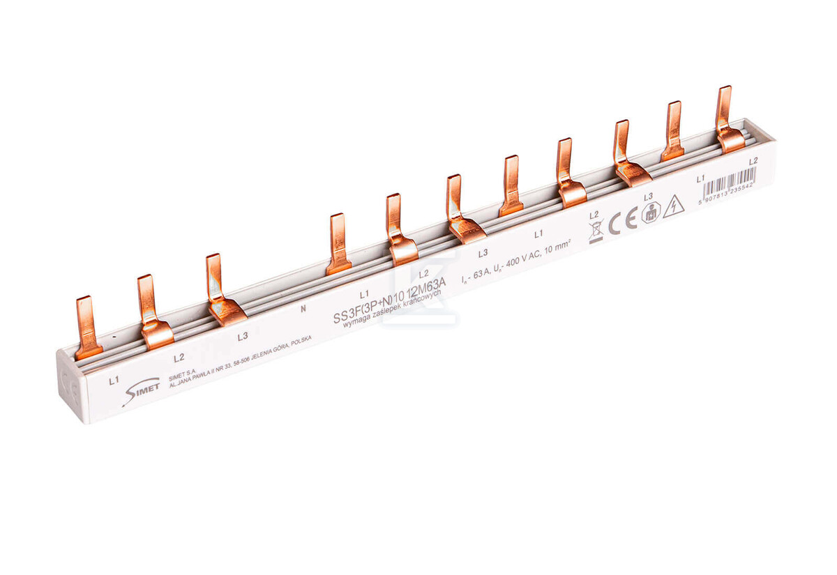 Шина виготовлена з високоякісних матеріалів, що гарантує довговічність та стійкість до пошкоджень. Переріз 10 мм² та струмонесуча здатність до 63A роблять її ідеальною для ланцюгів з більшим споживанням струму. Штифтова конструкція дозволяє легко та надійно з'єднувати з різними типами модульних апаратів, а повна ізоляція підвищує безпеку використання. Шина призначена для монтажу в розподільних шафах, де служить центральною точкою з'єднання для окремих пристроїв. Довжина шини відповідає 12 модулям (17,8 мм на модуль), що полегшує адаптацію до конкретних потреб установки.