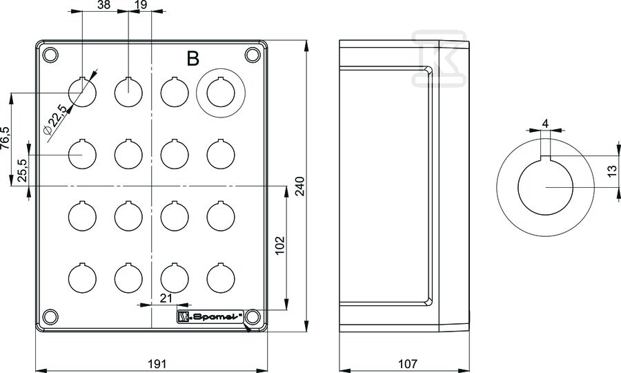 Касета має аж 16 отворів діаметром 22 мм, що дозволяє гнучко розміщувати елементи керування – кнопки, індикатори, з'єднувачі тощо. Завдяки цьому ви можете адаптувати її до конкретних потреб застосування. Сіра кришка з поліаміду захищає внутрішній простір від пилу та вологи, а ступінь захисту IP65 забезпечує безпеку в складних умовах навколишнього середовища.