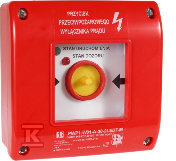 Ця червона, настінна кнопка запуску ПВП1 є надійним пристроєм, що служить для ручного запуску протипожежного вимикача струму. Її основним завданням є відключення живлення у разі пожежі, що має ключове значення для безпеки людей та майна. Кнопка призначена для монтажу поблизу входів до будівлі або головного з'єднання, з чітким маркуванням.