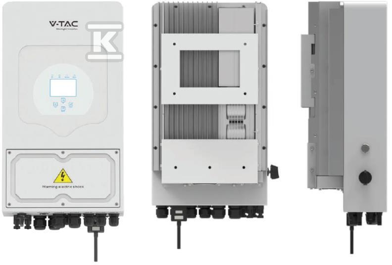 Інвертор був розроблений з урахуванням довговічності та надійності. Корпус зі ступенем захисту IP65 забезпечує стійкість до атмосферних впливів, що дозволяє монтаж як всередині, так і зовні будівлі. Кольоровий сенсорний екран LCD полегшує експлуатацію та моніторинг параметрів роботи пристрою. У комплекті є всі необхідні аксесуари для монтажу (перетворювачі, датчик температури, монтажний комплект) та модуль WiFi – що усуває додаткові витрати на придбання. Пристрій охоплюється 10-річною гарантією виробника DEYE V-TAC.