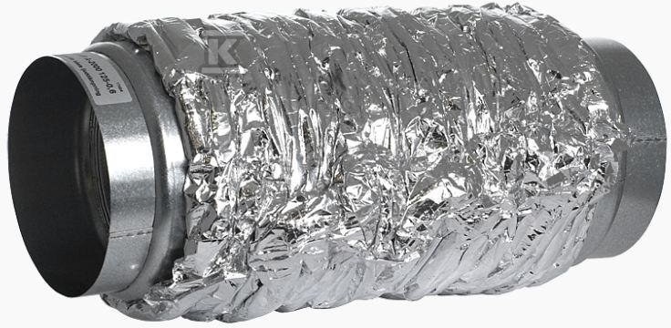 Канальний глушник для гнучких з'єднань у системах вентиляції. Внутрішній шар: гнучка перфорована алюмінієва трубка. Середній шар: мінеральна вата товщиною 25 мм. Зовнішній шар: вогнезахисна та стійка до стирання алюмінієва фольга