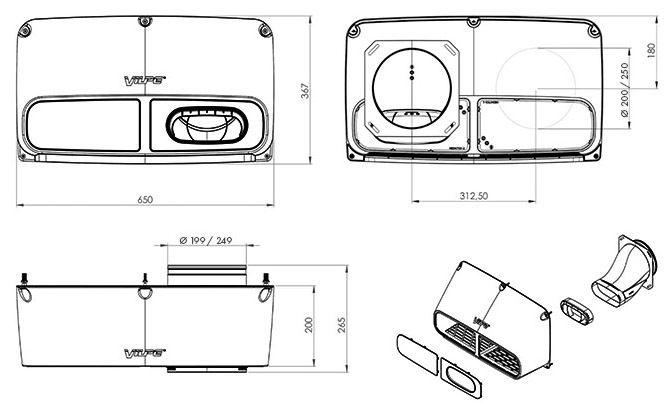 Застосування: регульований настінний забір і витяжка повітря в одному пристрої для систем механічної вентиляції в одно- та багатоквартирних будинках. Конструкція повітрозабірника і пускової установки Vilpe IO дозволяє змінювати напрямок роботи, що дозволяє розташовувати вхідний і вихідний отвір повітря ліворуч або праворуч. Діаметр: fi 200 мм. В комплекті: повітрозабірник і пускова установка в одному, трубка Вентурі, інструкція по збірці.