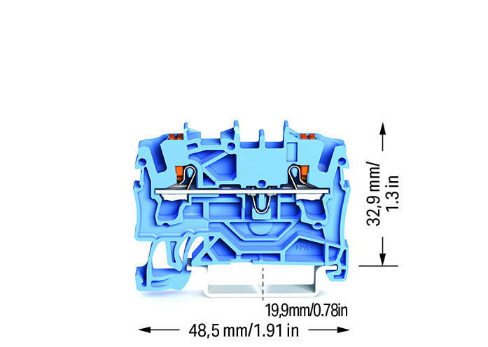 Перехідна з'єднувальна клема 2-провідна, з кнопками, 2,5 мм², з вимірювальним отвором, для застосувань Ex i, опис збоку та посередині, на DIN-рейку TS 35 x 15 і 35 x 7,5, Push-in CAGE CLAMP®, 2,50 мм², синій. 2202-1204
