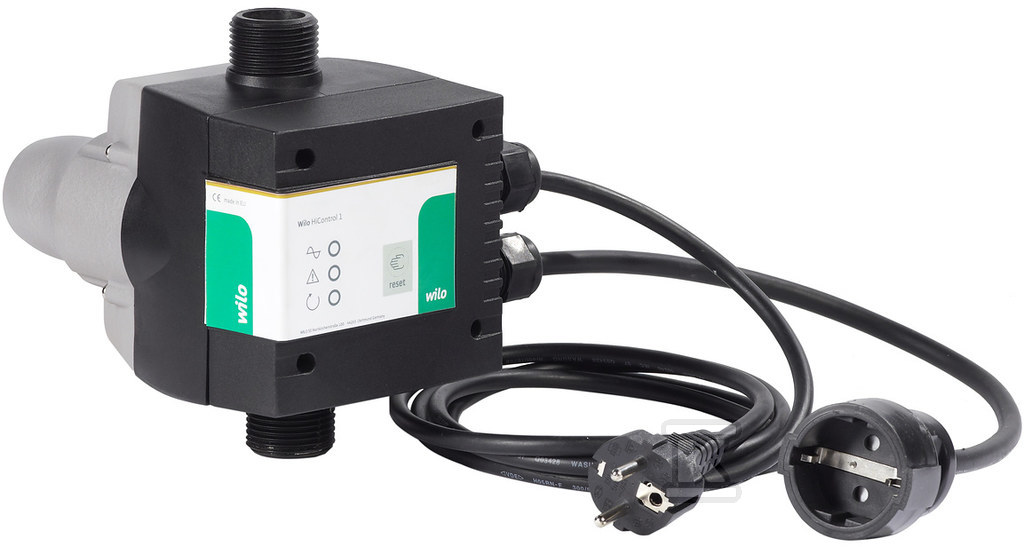 HiControl 1-EK – це датчик тиску та потоку з електронним керуванням із захистом від сухого ходу та неповернення. Додатково з’єднувальний кабель 2,5 м із заземленою вилкою та розеткою для підключення насоса.